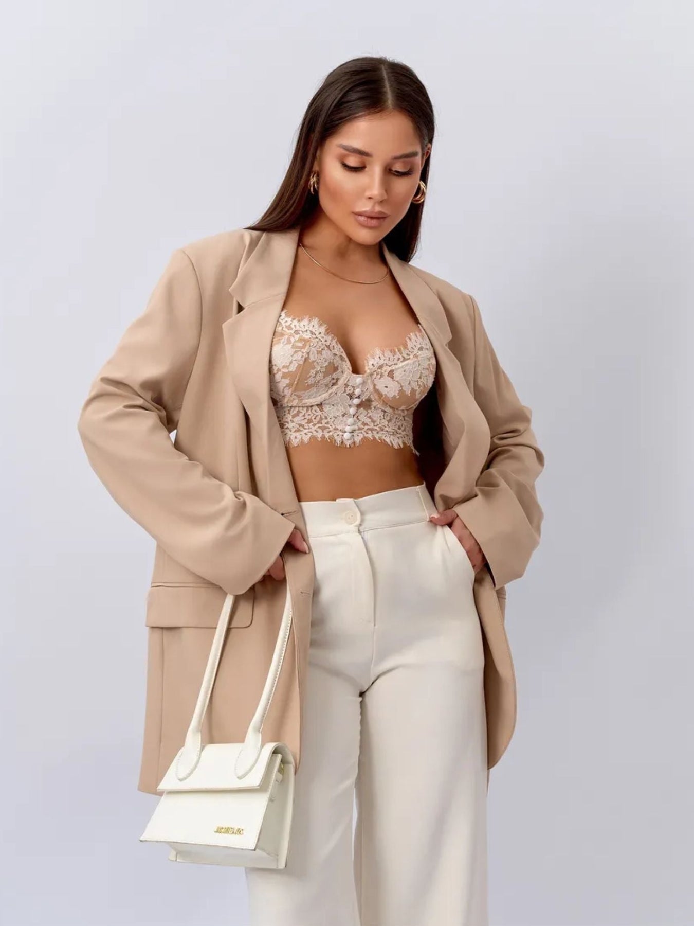 Isalie blends delicate seduction with luxurious sophistication. Featuring intricately embroidered lace, a corset-inspired design, and charming details like decorative buttons, this two-piece set is made for life’s most special moments — from weddings and honeymoons to romantic evenings. The refined design softly embraces your skin, wrapping you in pure femininity and grace.